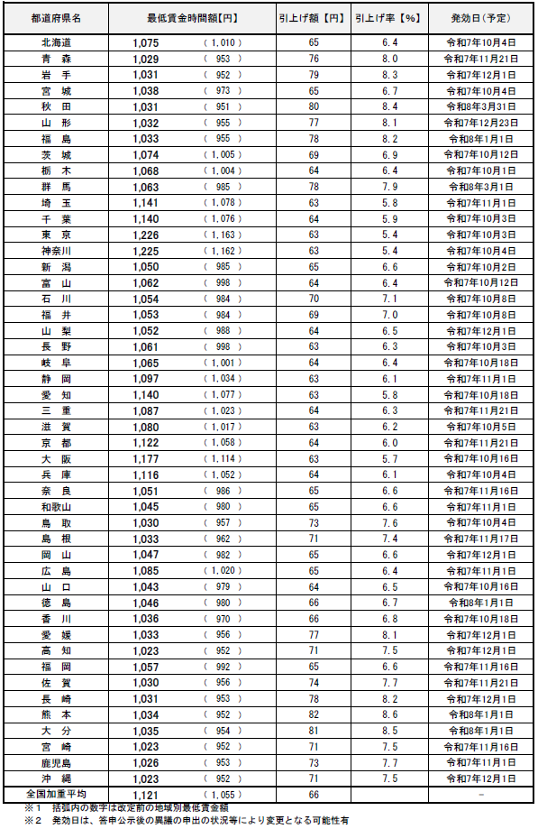 令和7年度10月からの最低賃金一覧表及び移動販売における最低賃金の考え方