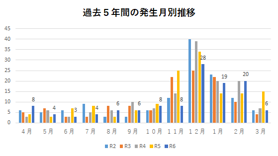タイヤの脱輪発生件数は冬タイヤ装着後に特に多い傾向が見てとれます。