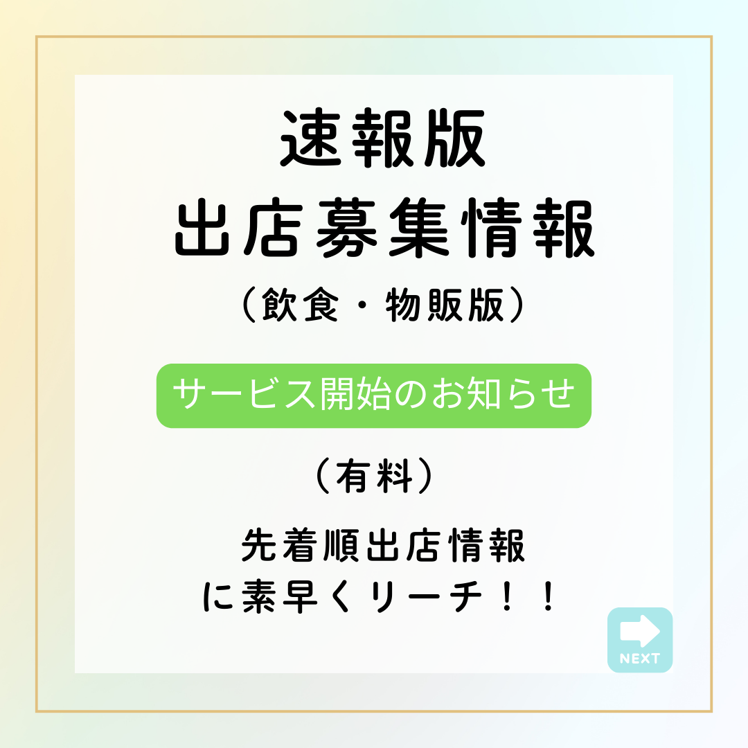 【先着順案件】こちらに掲載するのは選考制の案件、抽選制の案件のみとなります。先着順の案件については速報版出店募集情報(有料)にて平日なら毎日、LINEにて速報でお知らせしております。